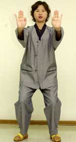 ◁ 간(肝)에 좋은 동작이다. 손바닥을 위로 보이게 해서 하단전 부위에 놓은 다음 숨을 들이마시면서 천천히 올린다. 그 다음 한쪽 발을 앞으로 내밀면서 숨을 내쉬며 손바닥을 바깥쪽으로 해서 앞으로 내민다.
