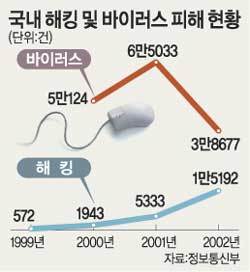 한편 지난해 바이러스 감염 건수가 감소한 것은 2000년에 펀러브(Funlove), 2001년에 님다(Nimda) 및 코드레드(CodeRed)가 피해를 끼친 것처럼 짧은 시간에 대규모 피해를 일으킨신종 바이러스가 지난해에는 출현하지 않았기 때문인 것으로 분석됐다.그런데 전체적인 바이러스 피해 건수는 감소했으나 공격기법이 다양한 클레즈(Klez)가 기승을 부렸다. 또 외국에서는 이미 활동이 주춤한 님다나 펀러브가 지속적으로 피해를 끼치고 있는 것이 문제점으로 지적됐다.