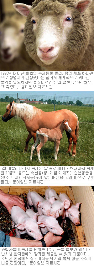 세계 과학자들이 복제하고 싶은 동물후보 1순위는 무엇일까. 서울대 수의학과 황우석 교수는 ‘장기이식용 돼지’라고 단언한다. 인체 장기와 유사한 크기와 기능을 지닌 돼지를 대량으로 복제한다면 이식할 장기가 턱없이 부족한 현실을 극복할 수 있다.