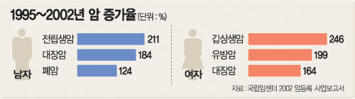 최근 국립암센터가 발표한 2002년 암등록사업보고서에 따르면 전국 139개 종합병원에서 신규로 암 진단을 받은 건수는 2001년 9만1944건에서 2002년 9만9025건으로 7.7% 정도 늘었다.