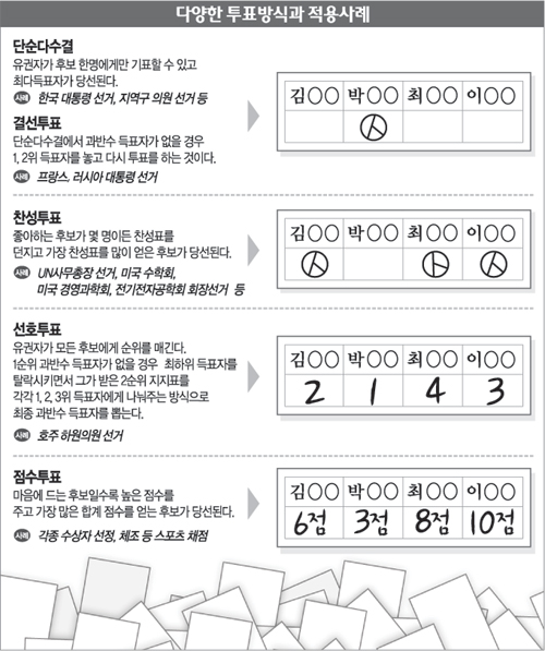 서울대 총장 선거는 두 명의 후보에게 찬성표를 던진다. 한 명만 찍도록 할 경우 교수 숫자가 많은 의대와 공대가 총장을 독점할 수 있기 때문이다. 투표 방법은 얼마든지 만들어낼 수 있는 것이다.
