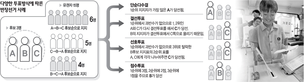 요즘 초중고등학교에서는 결선투표로 학급 반장을 뽑는 곳이 꽤 많다. 여러 후보가 난립하기 때문에 1차 투표에서 과반수 득표자가 없는 경우가 빈번하다. 그래서 1, 2위 득표자를 놓고 다시 한번 투표를 하는 것이다.