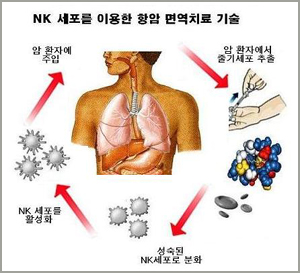 암 환자의 경우 정상인에 비해 NK세포의 수가 매우 적고 기능이 극히 떨어져 있다.