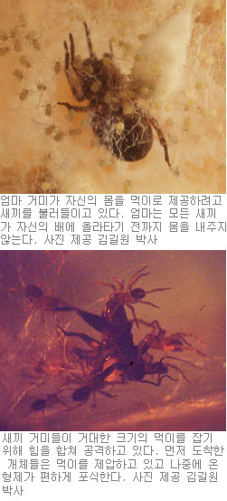 하지만 이 먹이가 금세 바닥이 나면 어미는 자신의 몸을 새끼들에게 내준다. 더듬이나 다리로 거미줄을 두드리며 새끼들에게 ‘모이라’는 신호를 보내는 것.