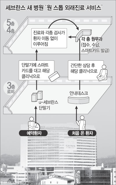 ▽유비쿼터스 환경=예약 환자는 3층 로비에 설치된 단말기에 처음 접수 때 받은 스마트카드를 댄다. 무인안내시스템인 ‘U-세브란스 도우미’는 환자의 개인정보가 담긴 이 스마트카드로 작동된다. 단말기 스크린에는 진료 예약 내용과 시간, 가고자 하는 클리닉 등이 평면도와 화살표로 안내된다. 접수를 위해 번호표를 들고 긴의자에 앉아 지루하게 기다릴 필요가 없다.