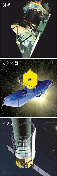 3대 우주망원경은 구경이 허블망원경(2.4m)보다 크다. 허셜망원경과 스피카가 3.5m이고 제임스웹망원경은 6m에 달한다. 공교롭게도 이들은 모두 허블이 사용한 가시광선이 아니라 눈에 보이지 않는 적외선으로 우주를 관측한다.