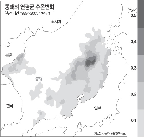 최근 서울대 해양연구소가 1985년부터 2001년까지 미국해양대기국(NOAA) 인공위성이 수집한 자료를 분석한 결과에 따르면 동해 수온이 연평균 섭씨 0.087도씩 올라 17년간 1.5도 상승한 사실이 처음 밝혀졌다.