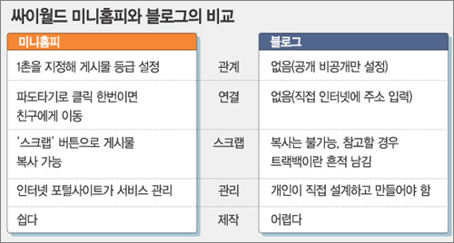 미니홈피도 크게 보면 일종의 블로그. 그러나 싸이월드의 인기 뒤에는 ‘1촌 맺기’라는 독특한 서비스가 있다.
