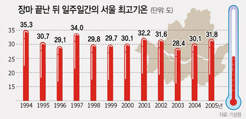 그러나 장마가 끝난 19일부터 25일까지 일주일간의 서울지역 낮 최고기온은 31.8도로 지난 12년 가운데 4번째로 더운 해로 나타났다. 아침 최저기온 역시 평균 25.2도로 열대야 기준(25도)을 넘고 있다.
