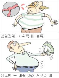 ⑤당뇨병에 의한 비만=심혈관계 이상에 의한 비만과 거의 유사하다. 다만 위쪽 배보다는 배꼽 바로 위쪽이 개구리 배처럼 볼록하게 튀어나오는 경향이 강하다. 식사 후 배가 빨리 불러오는 경향이 있으며 평소 단 음식을 많이 찾는 편이다. 또 피부가 대체로 따뜻한 느낌이 많다. (도움말=강북삼성병원 가정의학과 박용우 교수)
