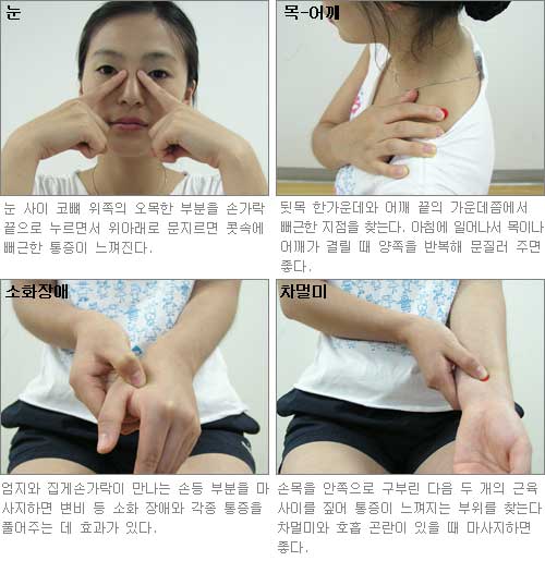 일단 뻐근한 부분을 손끝으로 살짝살짝 누르면서 아픔이 가장 심한 지점을 찾는다. 이곳을 3∼5초 약간 아플 정도로 꾹 눌러 주다가 힘을 빼고 작은 동그라미를 그리며 5초 정도 풀어준 다음 다시 누르는 과정을 5회 반복한다.