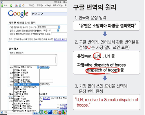 하지만 구글은 지금까지 이루어진 수많은 번역을 조회해 빈도가 가장 높은 경우를 올바른 번역으로 채택한다. 유엔회의록 원본과 번역본을 사용해 통계를 내면 모든 언어를 다 번역할 수 있다. 표본이 많을수록 정확도는 더 높아진다.