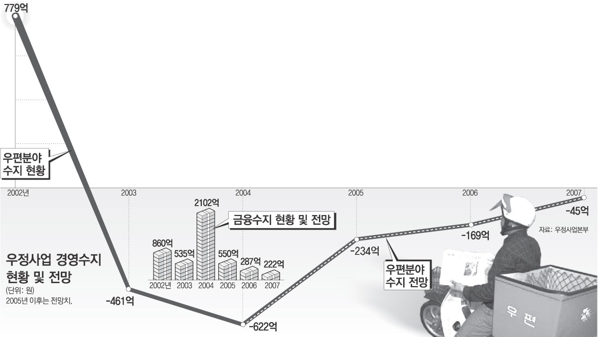인터넷 보급이 확산되고 민간 택배회사와의 경쟁이 치열해지면서 우편 관련 사업은 2003년부터 적자로 돌아섰다. 특히 농어촌 지역에 설립된 ‘별정우체국’의 적자폭이 크다.