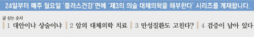 대체의학 열풍이 불고 있다. 요가 명상 등 이른바 ‘참살이(웰빙) 운동’이나 기체조 경락마사지도 대체의학의 한 종류다. 대체의학은 미국 유럽에서는 정통 현대의학에서 다루지 않는 모든 분야를 뜻하지만 국내에서는 현대의학 한의학 이외의 영역을 말한다. 민간요법도 포함된다.