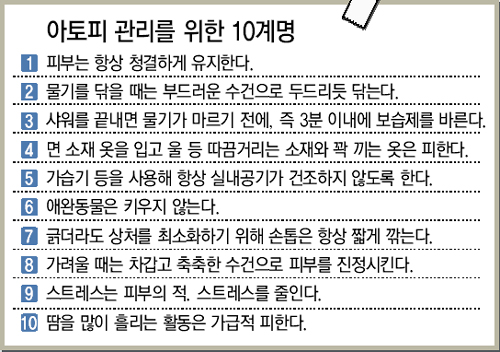 그러나 아토피는 평생 관리와 치료를 해야 하는 일종의 난치병이다. 그런데도 불구하고 많은 사람이 ‘비법(秘法)’을 찾다가 낭패를 본다. 지난해에는 어린이 아토피피부염 환자가 식초와 죽염을 바르는 ‘식초요법’을 썼다가 패혈증으로 숨지는 사고가 발생하기도 했다. 민간요법은 잊고 꾸준히 병원을 다니며 치료하자.