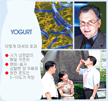 ▽유산균의 작용은=사람의 몸속엔 수백 종의 미생물이 있다. 이들 중 일부는 자라서 사람에게 나쁜 물질을 많이 만들어 병을 일으키기도 한다. 요구르트를 먹으면 유산균이 장내에서 자라면서 장내에서 세력을 확장한다.