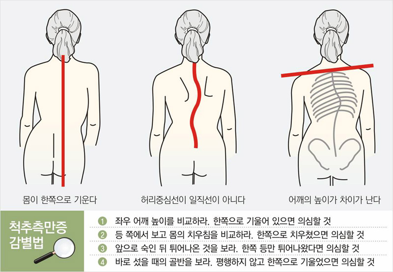 척추측만증은 말 그대로 허리가 옆으로 휘는 병. 간단한 X선 검사만으로도 진단할 수 있다. 선천성이거나 소아마비, 뇌성마비 등의 합병증으로 생기는 경우를 뺀 90%가 원인이 밝혀지지 않았다.