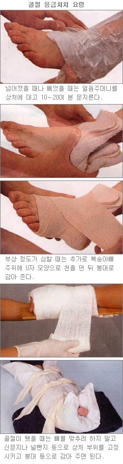 ▽응급조치를 잘 하라=골절이 됐다면 다친 부위를 살짝만 눌러도 극심한 통증이 나타난다. 그러나 섣불리 뼈를 맞추려고 손을 대면 안 된다. 오히려 증상을 악화시킬 뿐이다. 바로 응급실을 찾는 게 가장 현명하다. 119에 도움 요청 전화를 건 뒤 다친 부위에 손을 대지 않으면서 부목을 대고 고정해 주는 게 좋다.