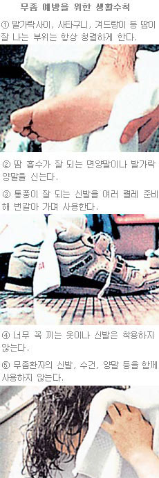 ▽지금부터 예방하라=무좀이 생긴 뒤 치료하는 것도 중요하지만 그보다는 무좀균이 생기기 쉬운 환경을 미리 차단하는 게 가장 좋다.