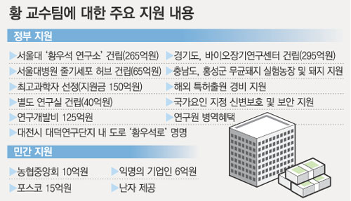 우선 정부는 지난해 서울대병원에 ‘세계줄기세포허브’ 건립 비용으로 65억 원을 지원했다. 또 서울대 수의대에 ‘황우석연구소’를 설립하기로 하고 총 265억 원의 지원비용 가운데 올해 예산에 100억 원을 반영해 집행했다. 또 별도의 연구실 건립비 40억 원과 연구개발비 125억 원을 추가 지원하기로 했다.