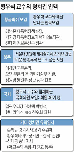 황 교수의 대전고 후배인 열린우리당 권선택(權善宅) 의원은 최근 국회의원 40여 명과 함께 ‘황우석 박사를 후원하는 모임’을 만들었다. 국민중심당 창당을 주도하고 있는 심대평(沈大平) 충남지사도 황 교수와 가깝게 지낸다.