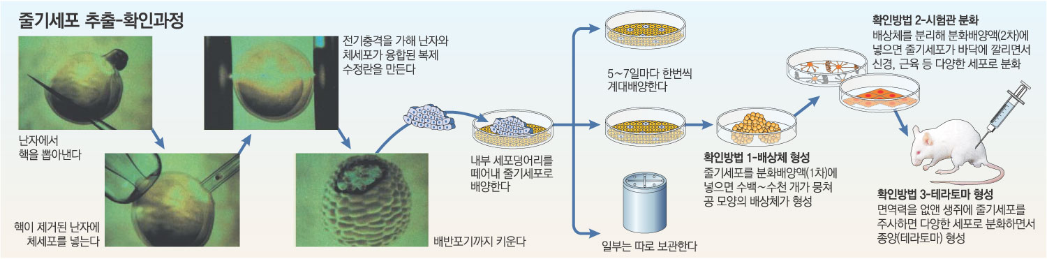 올해 사이언스지 논문에는 황 교수팀의 3가지 실험이 들어 있다. 시험관에서 줄기세포가 적절한 배양액으로 처리했을 때 다양한 종류의 세포로 분화됐는지, 분화 초기에 줄기세포들이 뭉쳐 동그란 공 모양(배상체·embryoid body)을 형성하는지, 그리고 생쥐에 줄기세포를 이식했을 때 다양한 세포로 분화되면서 종양(테라토마)이 형성됐는지다.