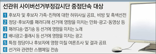 5월 지방선거를 앞두고 인터넷을 통한 흑색 비방선전이 심해지고 있다는 판단에 따라 중앙선거관리위원회가 지난달 31일 사이버선거부정감시단을 발족하고 대대적인 감시활동에 착수했다. 그러나 실제 인터넷에서의 선거법 위반은 누리꾼의 무지에서 비롯된 것도 많다는 게 선관위의 설명이다.