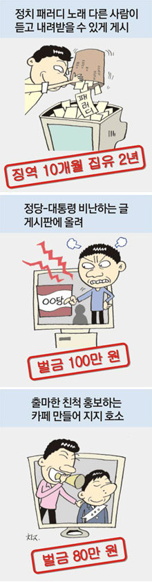 ▽포털 사이트에서 대통령, 특정 정당 비방했다면=또 다른 김모(49) 씨는 야후코리아 누리꾼 토론방에 “차떼기당의 알바는 돈으로 매수된 자들이고 열린당 알바는 자발적인 참여다”라는 등 한나라당을 비방하는 내용의 글을 14차례 올렸다가 벌금 100만 원을 선고받았다.