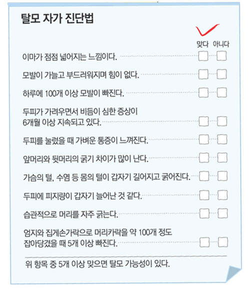 강 교수는 “대머리형 탈모는 머리카락이 점점 가늘어지다가 결국 솜털로 변하는 것”이라며 “그렇지 않다면 염증성 질환이나 갑상샘(갑상선) 질환, 자가면역질환인 루프스, 당뇨병, 결핵 등 다른 원인이 있는지 먼저 생각해 봐야 한다”고 말했다.