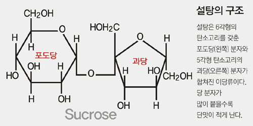 설탕은 당 분자 두 개가 연결돼 있다. 당 분자의 기본 구조는 다각형의 탄소 고리 주변에 다양한 가지들이 붙은 형태(그림). 분자 하나로 이뤄진 당을 단당류, 두 개는 이당류라고 한다. 설탕은 단당류인 포도당과 과당이 결합한 이당류다.