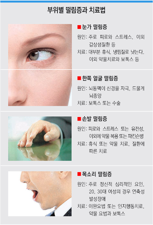 ▽떨림증 몸 곳곳에 생긴다=눈가 말고 손과 발 및 안면 부위에서도 흔히 떨림증이 생긴다. 술을 따르거나 수저로 국물을 먹을 때 손을 심하게 떨고 있는 사람을 볼 수 있다. ‘수전증’이라고 불리는 것으로 최근 미국의 한 역학 조사에 따르면 정상인 100명 중 96명에게서 수전증이 나타난다.