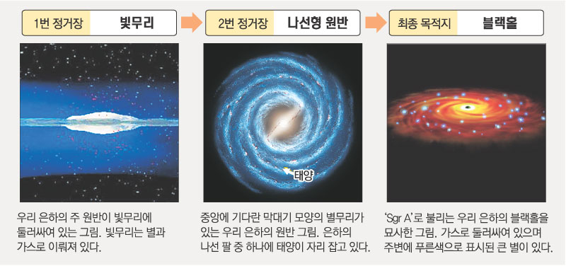 최종 목적지는 블랙홀이다. 우리 은하에 있을 것으로 추정되는 블랙홀은 ‘궁수좌 A’ 또는 ‘Sgr A’로 불린다. 대부분의 블랙홀은 큰 질량의 별이 붕괴하면서 생긴다. 그러나 우리 은하의 ‘Sgr A’ 같은 대형 블랙홀은 은하들과 함께 태어난 것으로 보인다. 주변 물질을 닥치는 대로 삼키기만 하는 블랙홀이 아니라 은하의 모양을 만들고 별들을 제자리에 배치하는 원동력이다.