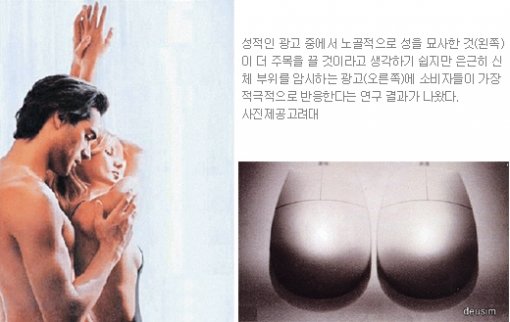 연구팀의 유홍구 연구원은 “광고를 보고 성관계에 대한 기억을 떠올리며 모델과 자신이 직접 관계를 맺는 것을 상상한다는 의미”라며 “성행위보다 노출 광고가 소비자를 광고 속으로 더 끌어들일 수 있다”고 설명했다.