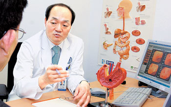 고 씨를 상세히 진찰한 노 교수. 위암에 노출될 위험요소 중 가장 큰 것은 음식을 불규칙하게 먹는 것. 그러나 고 씨는 △음식을 맵고 짜게 먹는 것 △고기를 구워 먹는 것 △가족 중 아버지가 위암에 걸려 사망한 것 등 위암의 가능성이 제법 높은 상황이었다. 고 씨처럼 위암 위험군에 속한 경우엔 40세 이상이 되면 1년에 한 번씩은 위 내시경 검사를 받는 것이 원칙이지만 그는 이번에 처음 검사를 받았다.