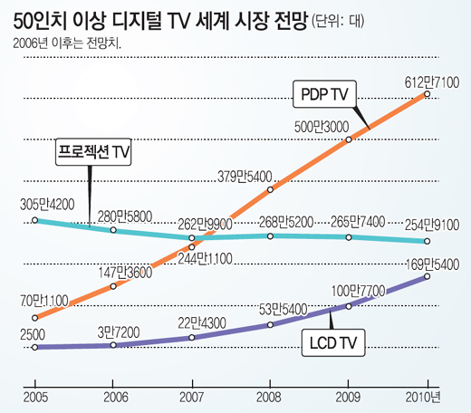 시장조사기관인 디스플레이서치는 지난해 50인치 이상 세계 디지털 TV 시장의 18.7%를 차지했던 PDP TV의 비율이 올해는 34.1%, 2008년 54.1%, 2010년 59.1%까지 높아질 것으로 전망했다.