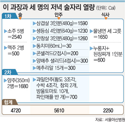 울산대 의대 서울아산병원에 따르면 이날 술자리의 열량은 총 1만2580Cal, 개인별로는 3145Cal에 이르렀다. 술의 열량을 빼더라도 각각 7860Cal, 1965Cal. 성인 남성의 하루 권장 열량은 2500Cal다.