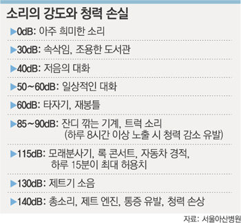 소음성 난청이란 커다란 소리 자극 때문에 청력에 문제가 생기는 것. 처음에는 아주 고음의 영역부터 들리지 않기 때문에 본인이 알아채지 못하는 경우가 많다. 이 교수는 “청각 세포는 손상되면 재생이 안 돼 치료가 불가능하다”며 “문제를 인식하면 이미 늦은 경우가 많아 예방이 중요하다”고 말했다.