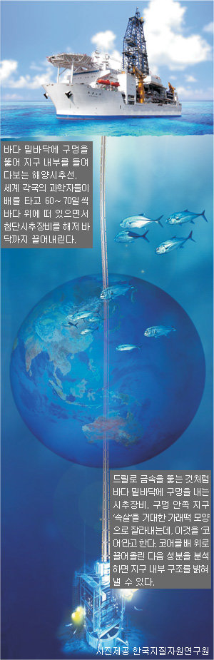 지금까지는 지구 내부를 조사할 때 전파를 쏘아 보내 되돌아오는 양상을 분석하는 ‘간접적’ 방법을 썼다. 그러나 IODP는 첨단장비로 해저 바닥에 수직으로 ‘직접’ 구멍을 뚫는다(시추). 해저시추는 구멍 안에서 길이 수 m∼수 km, 지름 수십 cm의 커다란 가래떡 모양의 덩어리를 꺼낸다. 지구 내부 일부분을 잘라내 그대로 들어 올리는 것이다. 이를 ‘코어(core)’라고 부른다. 지구 ‘속살’ 성분의 수직 분포를 고스란히 보여 주는 ‘표본’인 셈. 길이 9m, 지름 20cm짜리 코어도 장정 3, 4명이 옮겨야 할 만큼 무겁다.
