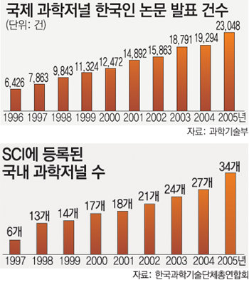 과학기술부가 지난해 말 발표한 ‘통계로 본 과학 한국의 오늘’에 따르면 세계 과학논문인용색인(SCI)에 등록된 과학저널에 실린 한국 과학자들의 논문은 2005년 총 2만3048건으로 러시아 인도 네덜란드에 이어 세계 14위.