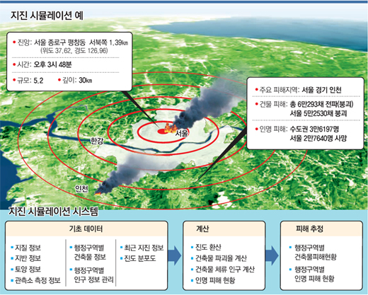 정부가 지난해 8월부터 사용 중인 지진재해대응시스템은 지질 정보와 건축물 정보 등 기초 데이터를 바탕으로 특정 지역에 지진이 일어났을 때의 건물과 인명 피해 상황을 예측할 수 있다. 하지만 시뮬레이션 결과는 지금까지 외부에 공개된 적이 없다.