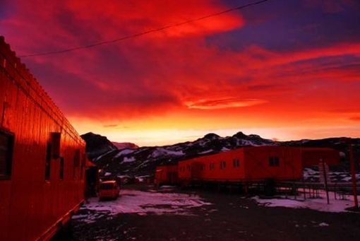 붉게물든 하늘과 세종기지. 남극 월동대원들은 최근 동아일보 앞으로 최신 소식과 자연 경관 사진을 담은 e메일을 보내왔다. <사진 제공=세종과학기지>