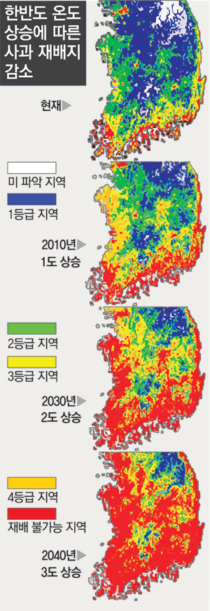 한 박사는 이런 온난화가 계속될 경우 “쌀, 보리, 사과 같은 주요 농산물 경작지가 북쪽으로 올라가고 한반도 연안에서 대구, 명태 등 한류성 어종도 거의 사라질 것”이라고 경고했다.