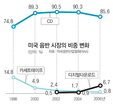 미국도 사정은 비슷하다. 미국음반산업협회(RIAA) 자료에 따르면 지난해 미국 음반 시장에서 카세트테이프가 차지하는 비중은 0.8%에 그쳤다.