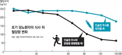 일본 아이치가쿠인(愛知學院)대 건강과학과 사토 유조 교수는 “초기 당뇨환자가 식사 후 인슐린 주사만 맞았을 때 혈당은 1시간 뒤 8% 정도만 떨어졌지만 주사와 1시간 운동을 병행하면 33% 떨어졌다”며 “혈당이 떨어지는 효과가 4배 이상”이라는 연구결과를 발표했다.