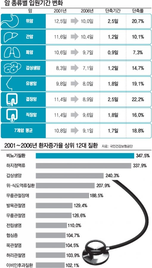 ▽암 입원기간 줄었다=2006년 상위 100대 입원질환에 위암(24위), 간암(37위), 폐암(39위), 갑상샘암(64위), 유방암(73위), 결장암(74위), 직장암(93위) 등 7개의 암이 포함됐다. 7개 암의 입원기간은 6년 새 평균 10.8일에서 9.1일로 1.7일(단축률 18.8%)이 짧아졌다.