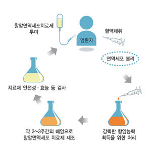 식약청은 올 초부터 몇 개 회사에서 개발한 항암면역세포치료제를 허가하여 새로운 개념의 항암치료가 많은 환자들의 희망이 되고 있다. 치료제의 주재료는 환자의 혈액 속에 있는 면역세포. 환자의 면역세포를 몸 밖에서 배양해 수를 늘리고 암세포를 죽일 수 있는 항암 능력을 높여 몸 속으로 다시 주입하는 방법이다. 환자는 치료제의 재료가 되는 20ml 혈액채취만 하면 그 후 배양이 완료된 시점부터 투여와 채혈을 반복하게 된다. 치료 과정에서 환자의 고통이 없고 부작용이 거의 없어 많은 환자들이 치료를 희망하고 있다.
