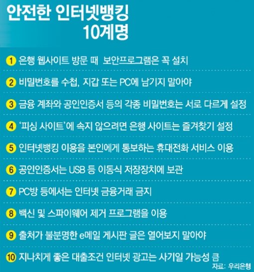 이와 관련해 금융당국과 금융계 관계자들은 범죄에 노출되는 것을 막기 위해 인터넷뱅킹 사용자들이 번거롭더라도 보안에 조금만 더 신경 써줄 것을 당부하고 있다.