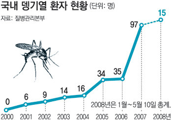 25일 질병관리본부에 따르면 2000년 국내에 한 명도 없던 뎅기열 환자는 2001년 6명, 2006년 35명, 2007년 97명으로 급증하는 추세다. 올해에는 5월 10일까지 15명의 뎅기열 환자가 발생했다.