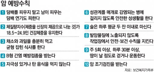 ▽담배를 끊어라=흡연은 폐암, 위암, 방광암, 식도암, 구강인두암, 후두암, 췌장암, 신장암의 원인이며 흡연자 본인은 물론 주위의 모든 사람에게 암 위험도를 증가시킨다.