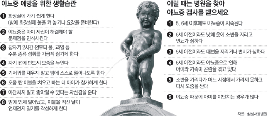《주부 유모(38) 씨는 초등학교 4학년생인 아들이 자꾸 밤에 오줌을 싸서 고민이다. 야단도 쳐보고 저녁식사 후 물도 먹이지 않아 보았지만 오줌을 싸는 버릇은 고쳐지지 않았다. 오히려 아들은 갈수록 주눅이 들고 소심해져 친구들과 잘 어울리지도 않았다. 아들과 함께 병원에 온 유 씨는 ‘소아 야뇨증’이라는 진단을 받았다.》